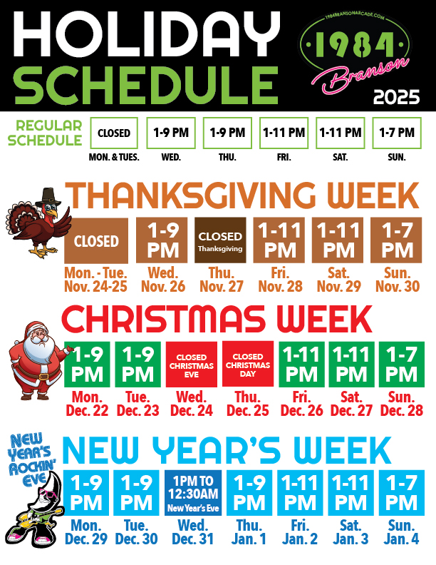 WELCOME ADMISSION LOCATION PARTIES VIDEO GAMES CONTACT US Classic 80s Arcade $12 Admission / All-Night Pass Unlimited Video Games Pinball, Air Hockey and Crane run on quarters Classic and Modern Pinball! $12 Admission / All-Night Pass Unlimited Video Games Pinball, Air Hockey and Crane run on quarters Have Your Party Here! Call ahead to book in advance Details here [PARTIES] Questions? Call us 417-320-6055 Classic 80s Arcade $12 Admission / All-Night Pass Unlimited Video Games Pinball, Air Hockey and Crane run on quarters REGULAR SCHEDULE MON. & TUE. CLOSED FRIDAY 1PM TO 11PM WEDNESDAY 1PM TO 9PM SATURDAY 1PM TO 11PM THURSDAY 1PM TO 9PM SUNDAY 1PM TO 7PM ADMISSION $12 ENTRY. ALL-NIGHT PASS! LOCATION WHERE TO FIND US PARTIES CALL AHEAD TO BOOK VIDEO GAMES FREE TO PLAY WE ACCEPT CARDS LOCATION Shoppes at Branson Meadows4240 Gretna RD, Branson MO Click for directions to find us. BUY PASSES ONLINE!LIKE US ON FACEBOOK! 4240 Gretna Rd The Shoppes at Branson Meadows (417) 320-6055